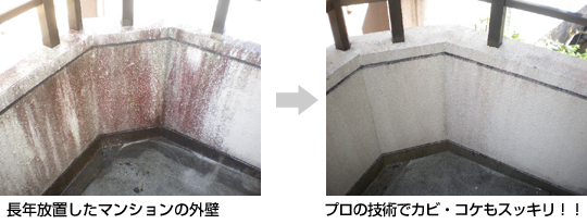 外壁は建物の「顔」です。 しかし、排気ガスやカビ・コケで汚れていきます。 当社では、汚れを取り除き、再汚染防止のためにコーティングまで致します。 詳しくは「ダイヤモンド・マジック」をご覧ください。