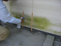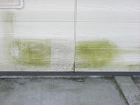 丸森の某アパート 日の当らない北側の壁面にコケが生えていました。ダイヤモンドマジィックの効果をわかっていただくために、デモ施工をしました。 |
